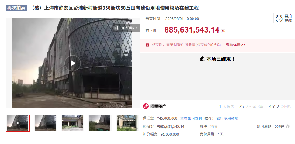 8月5日,据阿里资产披露的信息显示环球策路,上海市静安区彭浦新村街道338街坊58丘国有建设用地使用权及在建工程在8月1日以约8.856亿元的价格成交,竞得者为中国信达资产管理股份有限公司旗下企业。
